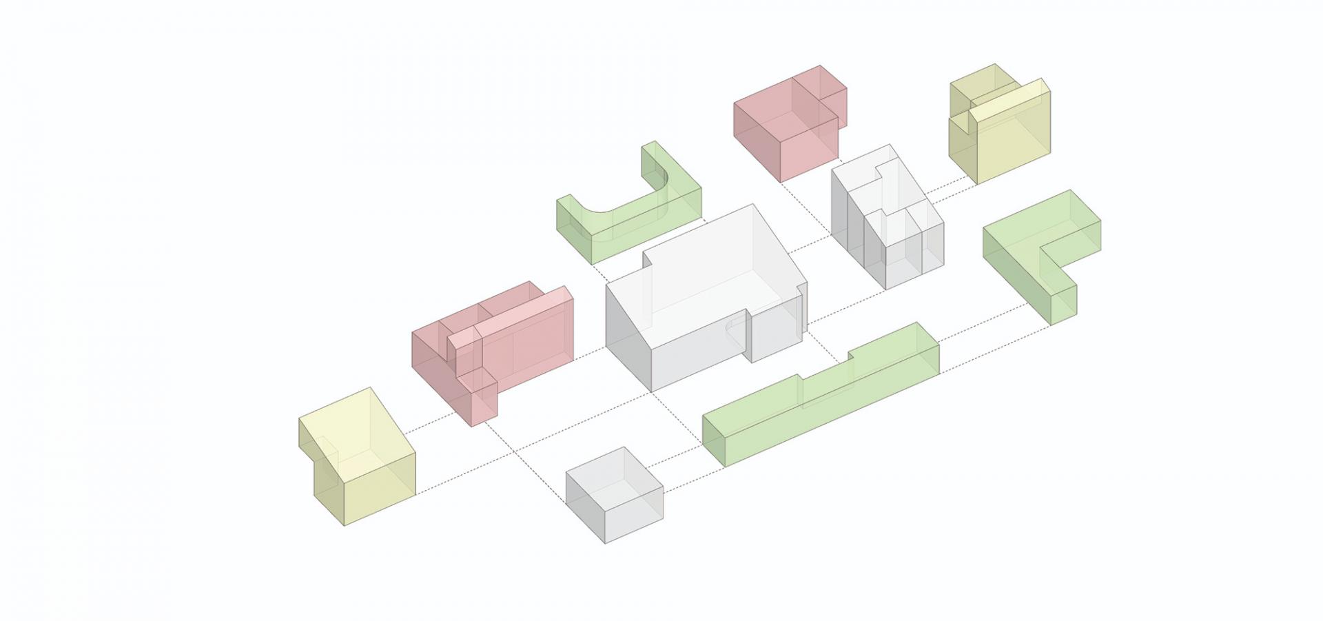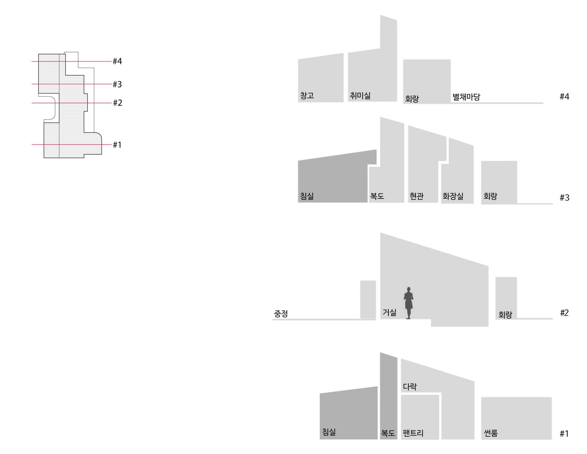 두 개의 경사지붕 아래에 만들어지는 다양한 내부공간들 |